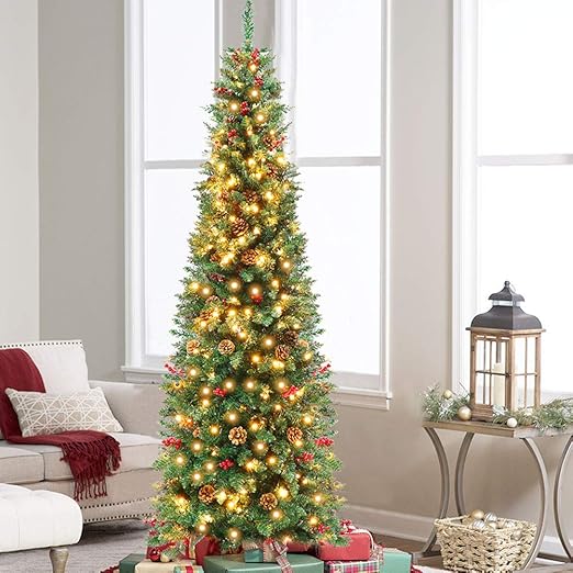 Amazon Com Aerwo 7 5ft Prelit Pencil Christmas Tree Led Slim Christmas Tree With 350 Clear Lights 900 Thicken Tips Tall Skinny Pine Artificial Christmas Tree With 55 Berrys And 55 Pine Cones Green