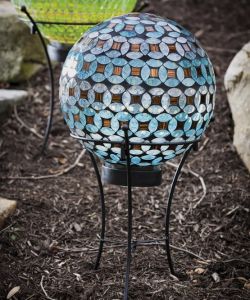 Smart Living Home. 975-Inch gazing ball in blue color can be displayed on a tabletop when you8217re entertaining guests or kept on a stand sold separately in the garden for a glowing ambiance among flowersMeticulously crafted hand-blown crackled glass construction giving crystal featureBattery-operated LED bulbs are powered by a solar panel for long-lasting energy-efficient useSolar panel present inside the gazing ball. Solar Mosaic Gazing Ball With Metal Stand Multi-Color Glass.