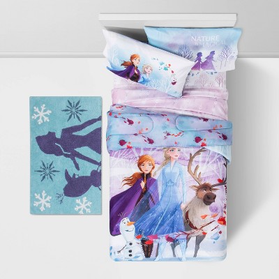 The set includes a reversible pillowcase flat top sheet in solid lavender and fitted bottom sheet in a lavender and white print and a comforter depicting Anna Elsa Olaf in a wintry forest setting. With hints of water color in blues and purples these items are a great addition to any Frozen. Rating 4500117 out of 5 117 1500.